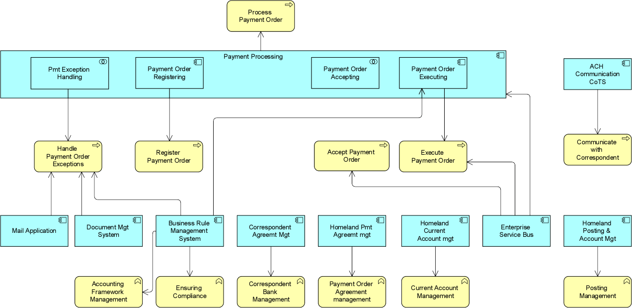 The case study continues on from here, showing in much more detail how the solution (adapting one of the internal systems) is selected, with technology choices such as the use of a rule management system to perform automated exception handling and compliance rule management, in order to support the STP services. One of the many views of this is shown below, depicting the main applications involved in Payments and the business processes they support.