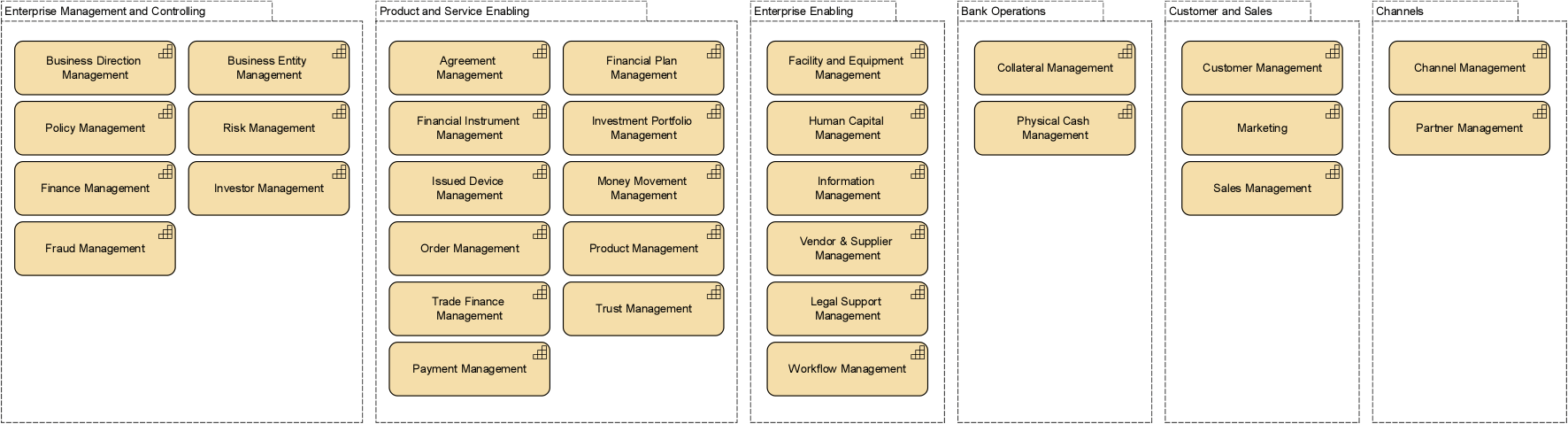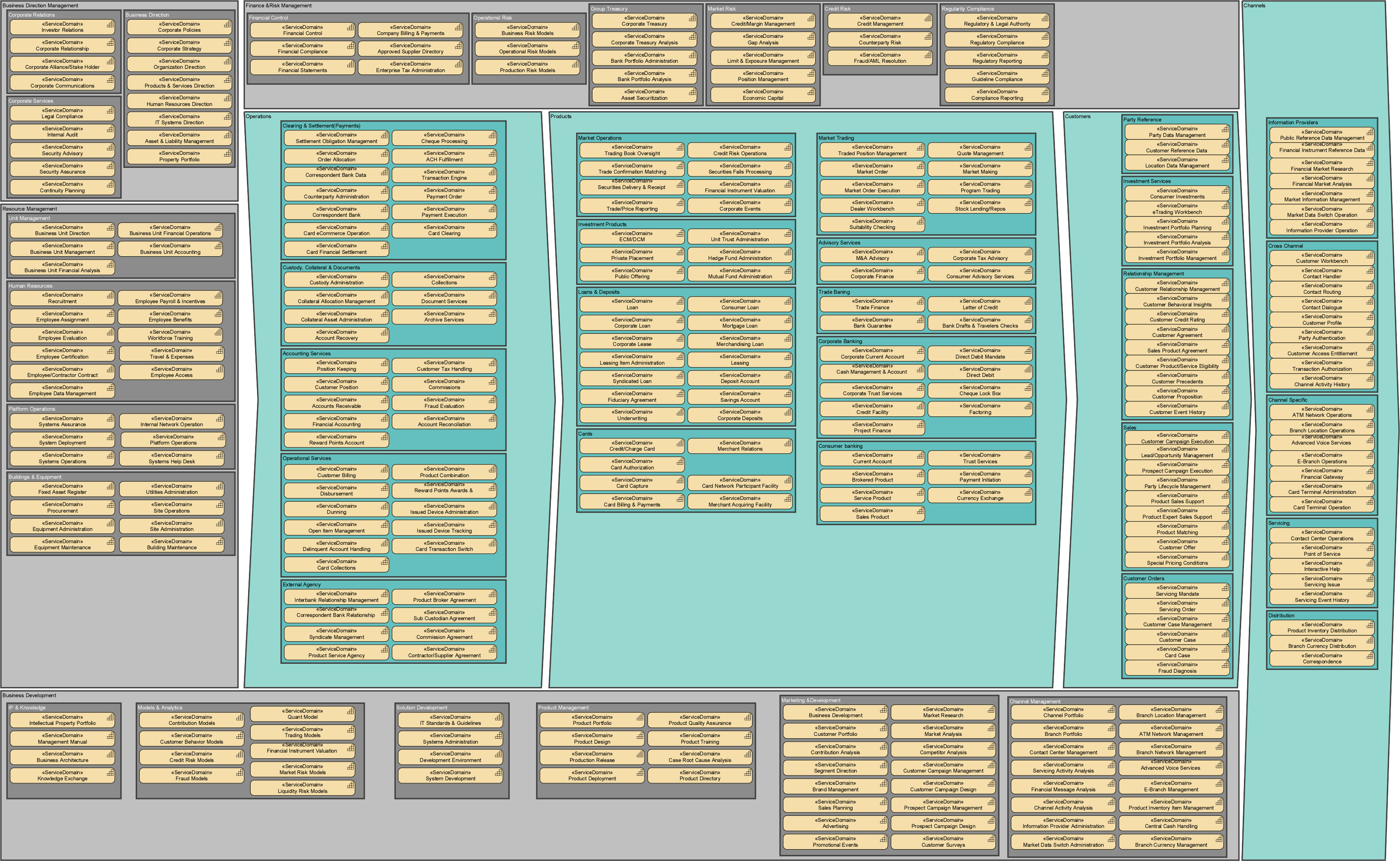 Recently, the Banking Industry Architecture Network (BIAN) published version 8.0 of its financial industry reference architecture (https://bian.org/servicelandscape-8-0/). This provides a comprehensive model of the business capabilities, business scenarios, service domains and business objects used in banking and other financial services.
